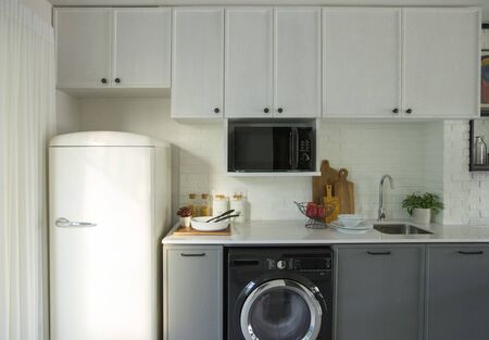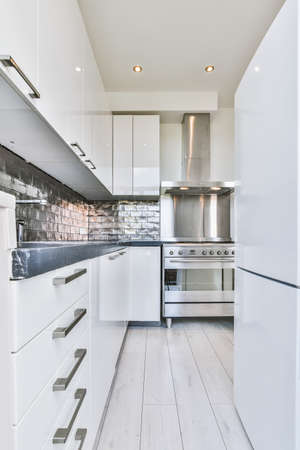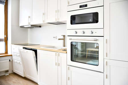 built-in appliances, white kitchen cupboard. furniture for interior of house