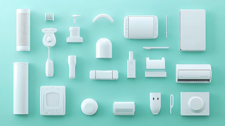 A visually striking collection of minimalistic white home appliances and gadgets arranged on a soft turquoise background, showcasing modern design and functionality.