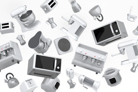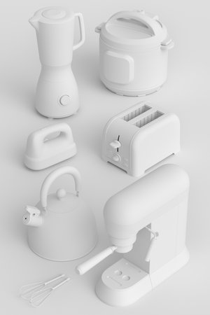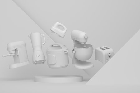 Electric kitchen appliances and utensils for making breakfast on monochrome background. 3d render of kitchenware for cooking, baking, blending and whipping