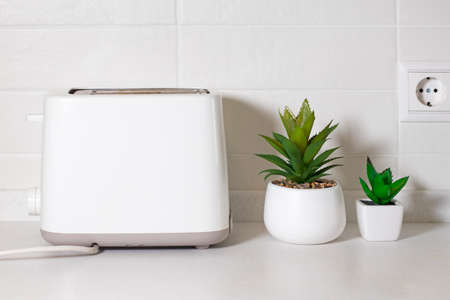 Toaster and artificial succulents in ceramic pots in the kitchen as an interior decoration. Copy space