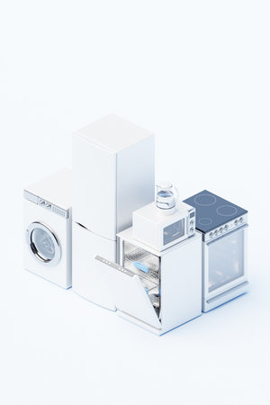 A modern appliances set including a dishwasher, washing machine, refrigerator, stove, and kettle, all designed with sleek, contemporary aesthetics for functional and stylish home solutions, 3D illustration