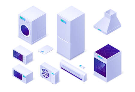 Isometric kitchen appliances electric home tech oven, hood, microwave and washing machine with floor scales and conditioner with refrigerator. Household technics, equipment, isolated 3d vector set