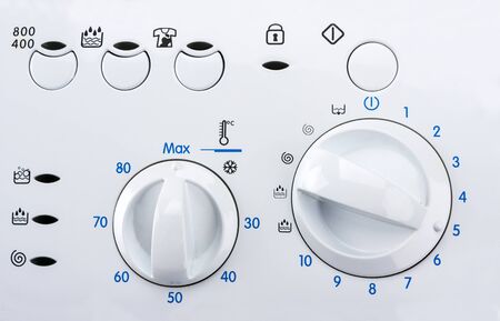 empty screen and buttons on control panel of modern washing machine on blurred background close view