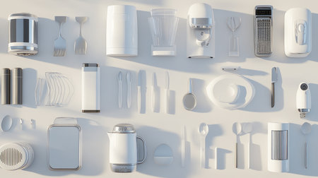 A stunning array of white kitchen appliances and utensils displayed on a light surface, highlighting simplicity and functionality in modern kitchen design.