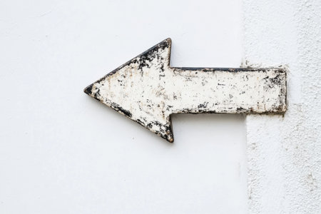 A weathered metal arrow sign directs attention to the left, contrasting against a smooth white wall that adds a minimalist touch.