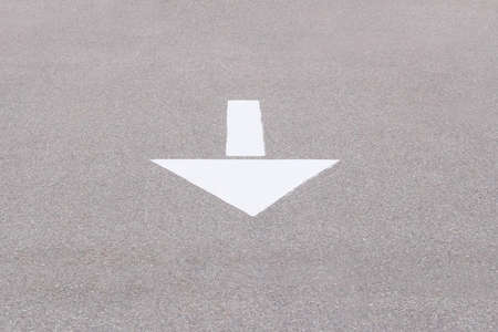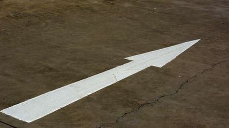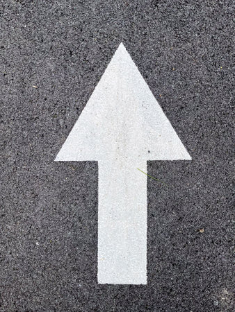 A white arrow painted on dark asphalt road surface pointing forward symbolizing direction and progress in minimalistic style