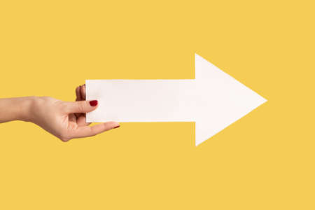 Closeup profile side view of woman hand showing white arrow in hands indicating aside, showing right direction. Indoor studio shot isolated on yellow background.