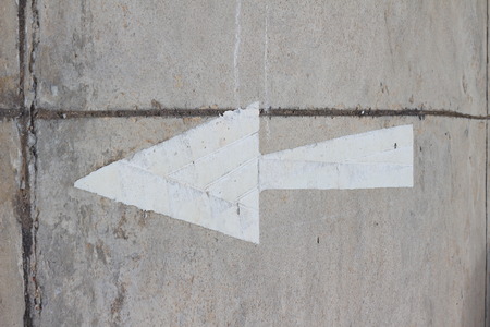 A clean white arrow is positioned on a rough textured wall, indicating a left direction in a minimalist design context.