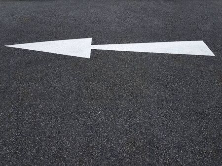 White arrow on asphalt pointing left in black and white. Concepts and signs fo ideas.