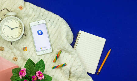 Kharkov, Ukraine - February 5, 2021: Skype application icon on Apple smartphone, creative flat lay background banner of messenger and social media network, logotype photo