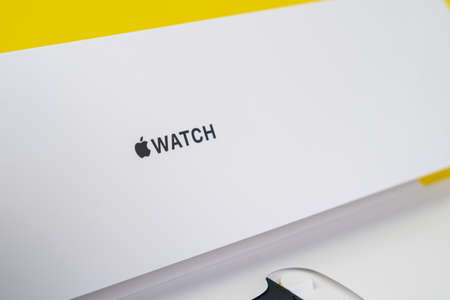RUSSIA ROSTOV - MAY 29 2021:Half-opened box with new unpacked new generation of Apple Watch with band lies on yellow background, close up, studio shot.
