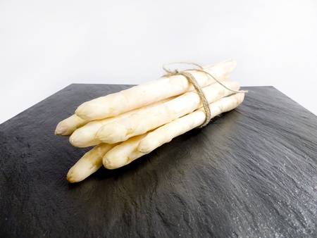 Asparagus on slate in front of white background