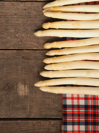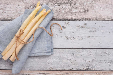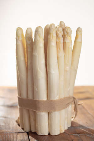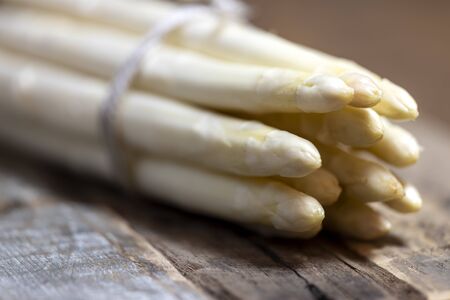 Fresh organic white asparagus on a rustic wooden kitchen table, healthy eating or seasonal food concept