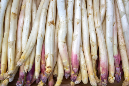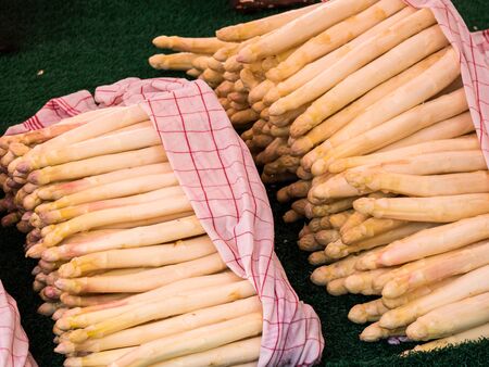 Bundles of large fresh white asparagus spears with a pink hue are for sale at an outdoor market stall in the spring in Zurich, Switzerland
