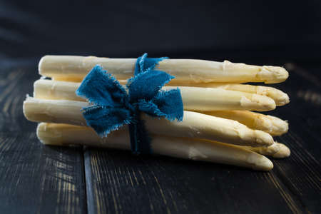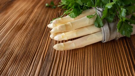 Bound white asparagus with fresh parsley on rustic wooden table. Close up photography with space for text. Concept background for cuisine and gastronomy.
