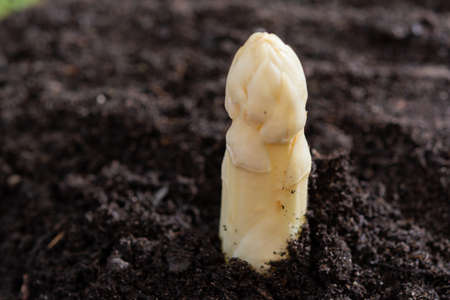 New spring season of white asparagus vegetable on field ready to harvest, white head of asparagus growing up from the ground on farm close up