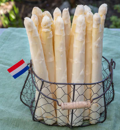 Dutch farmers high quality products, fresh white asparagus with Dutch flag in spring sunny garden