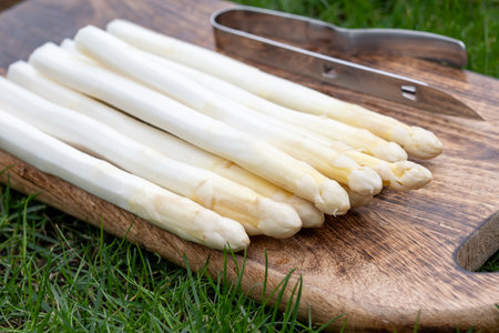 Delicate organic white asparagus ready to be peeled before they can be steamed