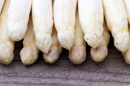 White fresh raw asparagus lie side by side on a wooden surface