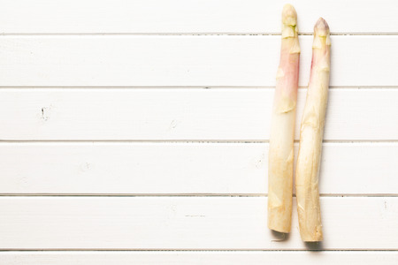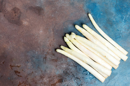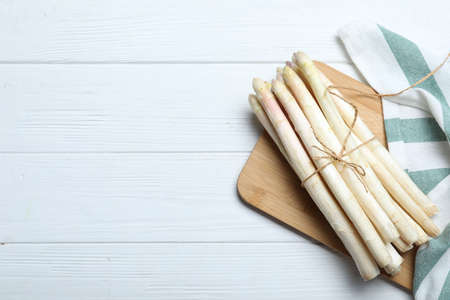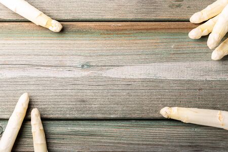Food background with white asparagus. Healthy food concept with copy space. New harvest of spring season, top view.