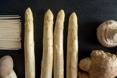 Raw ingredients set for cooking on black background: white asparagus, mushrooms, noodles and ginger. Overhead. Top view.