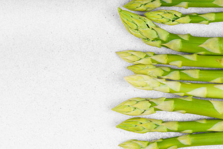 Bunch of raw fresh green asparagus stalks macro, close up on light gray textured background with copy space. Healthy food, fresh produce, cooking ingredient, vegetarian recipe, organic agriculture.