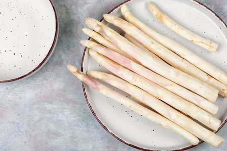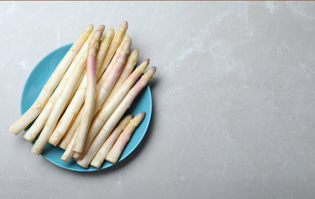 Fresh white asparagus on grey marble table, top view. Space for text