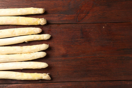 Fresh white asparagus on wooden table, top view. Space for text