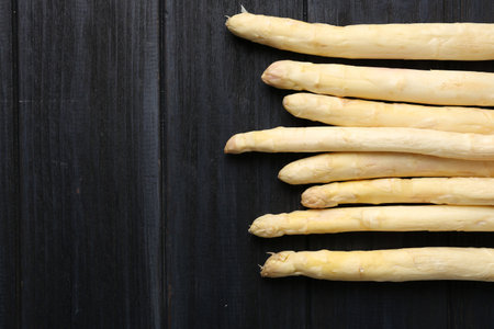 Raw white asparagus spears on black wooden table, flat lay. Space for text
