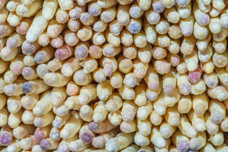 A pile of fresh, raw white asparagus