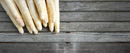 Fresh white asparagus on rustic gray wooden planks. Horizontal close-up of saisonal vegetables for a healthy nutrition concept with space for text.