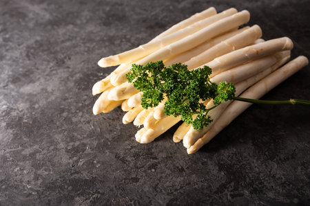 Freshly picked raw organic white asparagus spears for cooking healthy vegetarian food on a dark concrete