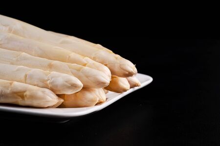 White organic asparagus on a white kitchen plate on a black background.Raw Organic White Asparagus.