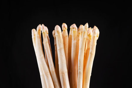 Bunch of fresh raw white asparagus spears on black background. Healthy greens, vegan food and ingredients for cooking concept. Closeup, copy space.