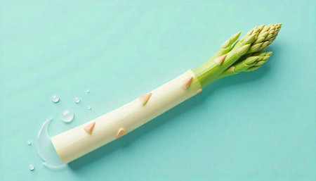 Elegant stylized asparagus on light blue background with water drops
