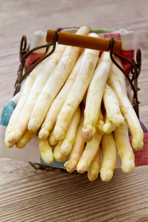 White asparagus in a metal basket. Healthy food concept with new spring season harvest. Selective focus. Copy space.