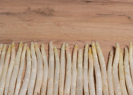 New harvest of white asparagus, high quality raw asparagus in line on table in spring season, ready to cook close up