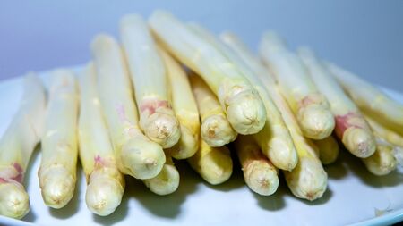 New harvest of white asparagus vegetable in spring season , washed white asparagus ready to cook close up, spring menu for restaurants