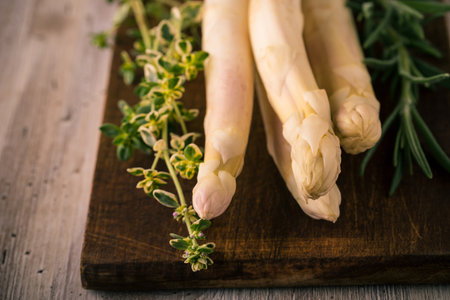 Horizontal photo of several pieces of white asparagus which is placed on dark wooden vintage board together with green herbs as rosemary and thyme. Board is on light colored table.