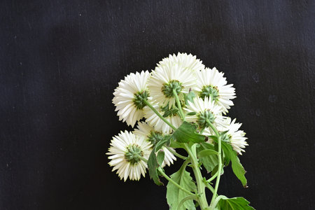 White chrysanthemum flowers on a black background, top view