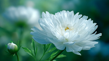 Elegant White Aster Blossom with Bud Against Soft Teal Backdrop