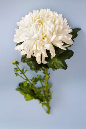 Large white chrysanthemum is on a blue background. Copy space