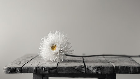 AI Generated. Single chrysanthemum on a weathered oak table flat lay