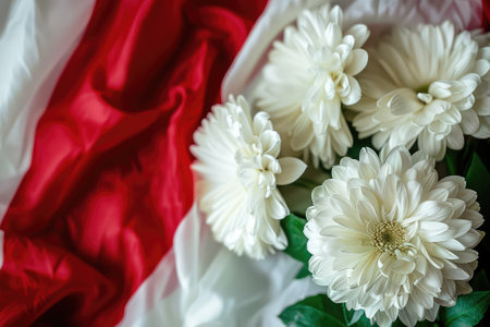 White chrysanthemums on the background of the flag of the United States of America