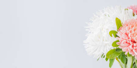 Floral background. Bouquet of white chrysanthemums. Selective focus, blurred background, space for text.