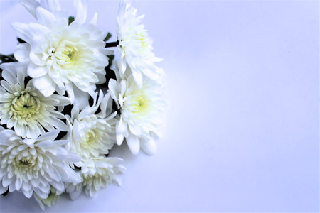 small white chrysanthemums, white delicate flowers on the table, space for text, minimalism