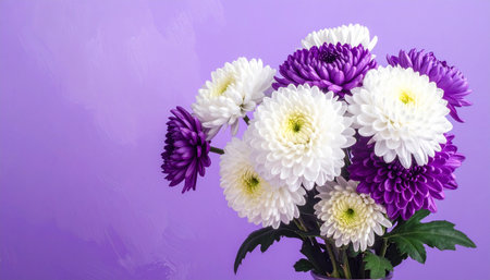 A lush bouquet of white and deep purple chrysanthemums is presented against a textured lavender backdrop.