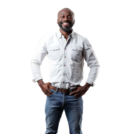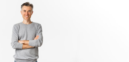 Image of successful and confident middle-aged man, cross arms on chest and smiling satisfied, standing determined over white background
