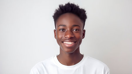 Portrait of a happy cheerful serious, troubled African American teenager guy with perfect skin, white background, banner. Advertising of teenage cosmetics, hair care products, medicines, perfumes, cosmetology, courses, college schools and trainings
