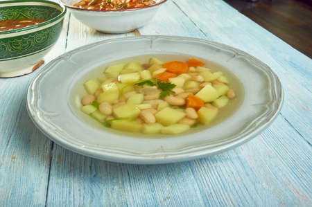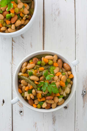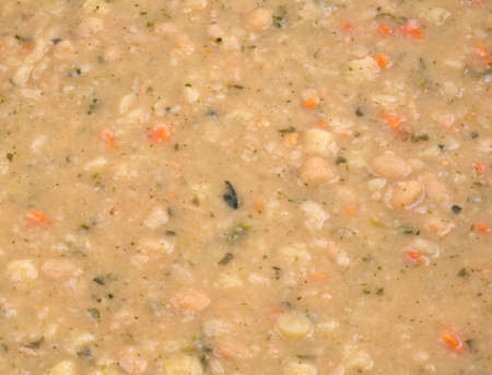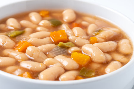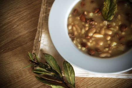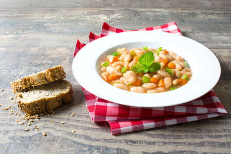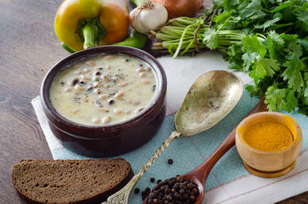 Beans soup of the big white and black grain bean, prepared in a large bowl